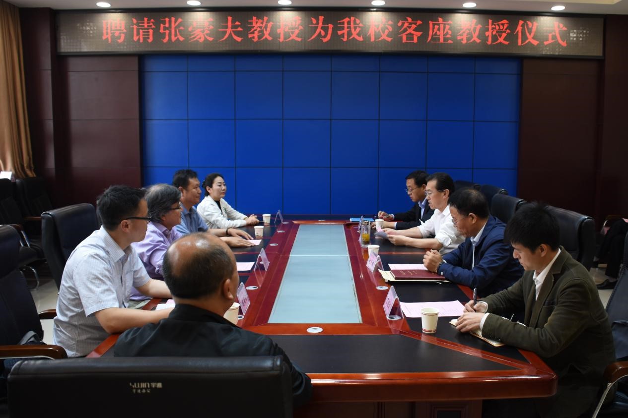 会上,司晓宏对张豪夫教授聘为我校音乐学院客座教授表示热烈欢迎和衷心感谢,他介绍了学校的办学历史、教师队伍、学科建设、办学优势特色和发展目标,并表达了对于音乐学院的发展与对外合作交流工作的高度重视。张豪夫教授表示对于聘任为我校音乐学院客座教授深感荣幸,并表示愿意把自己的人生经验与学识积累毫不保留地传授给文理学院的师生。音乐学院副院长魏安石简要介绍了张豪夫教授的基本情况及艺术成就。人事处处长宋崇碧宣读了关于聘请张豪夫教授为我校音乐学院客座教授的决定。随后,司晓宏为张豪夫教授颁发了聘书并合影留念。