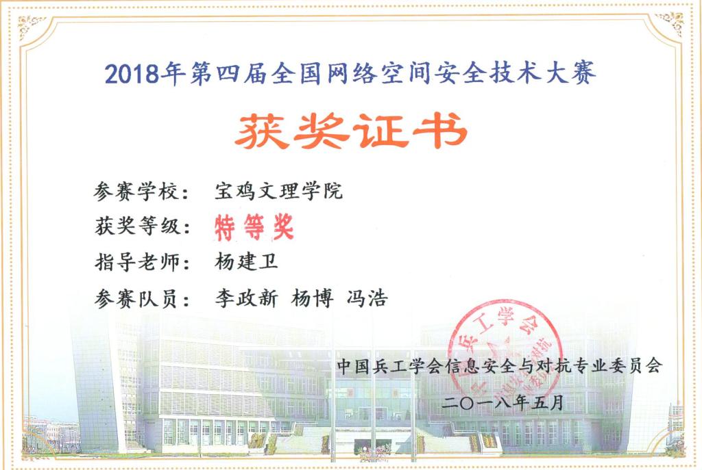 5月26日,2018年第四届全国网络空间安全技术大赛线下决赛在西安工业大学举行,我校代表队由杨建卫担任指导教师,由来自计算机学院2015级学生李政新、数学与信息科学学院2016级学生杨博、电子电气工程学院2017级学生冯浩组成的BUASlamp队经过六个半小时的精彩角逐,战胜其他32支队伍获得特等奖。
