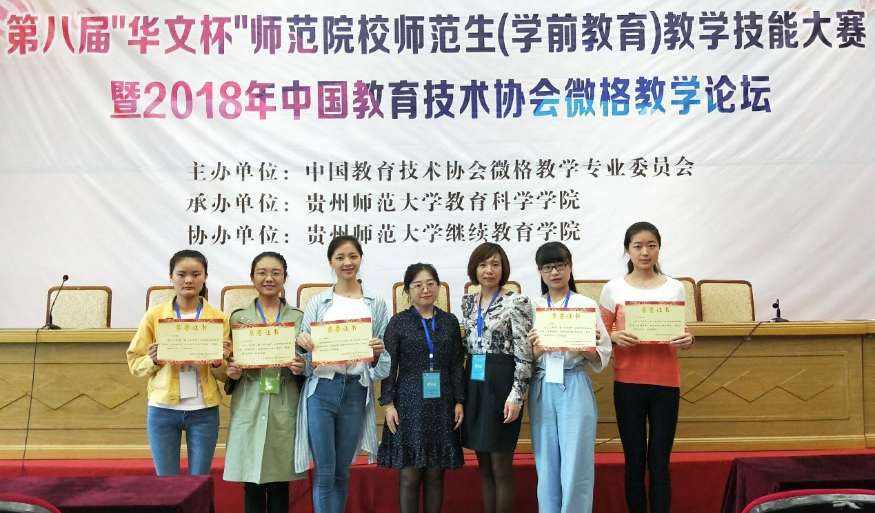 6月1日至4日,第八届“华文杯”全国师范院校师范生(学前教育)教学技能大赛在贵州师范大学举行。我校由教育学院教师张鹏妮、马丽娜带队,选派学前教育专业5名学生参加比赛并取得了优异成绩,其中,何晓琳、田思雨同时获教学技能比赛一等奖、教育活动方案设计三等奖,马雅璇获教学技能比赛二等奖、教育活动方案设计二等奖;白雯菲获教学技能比赛二等奖、教育活动方案设计三等奖;吴雅楠获教学技能比赛三等奖、教育活动方案设计三等奖。