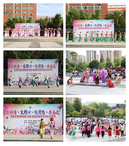 在四为园励志广场,少数民族学生进行了文艺展演。歌伴舞《共叙中国梦》、藏族舞蹈《天上草原》、黎族竹竿舞、傣族舞蹈《版纳印象》、师生共舞《爱我中华》等展现了各民族悠久的文化传统、丰富的民族艺术,洋溢着多民族和谐共处的热情气息。各少数民族学生还以T台秀的形式向在场师生展示了部分少数民族服装,体现了我国少数民族多彩的服饰文化。