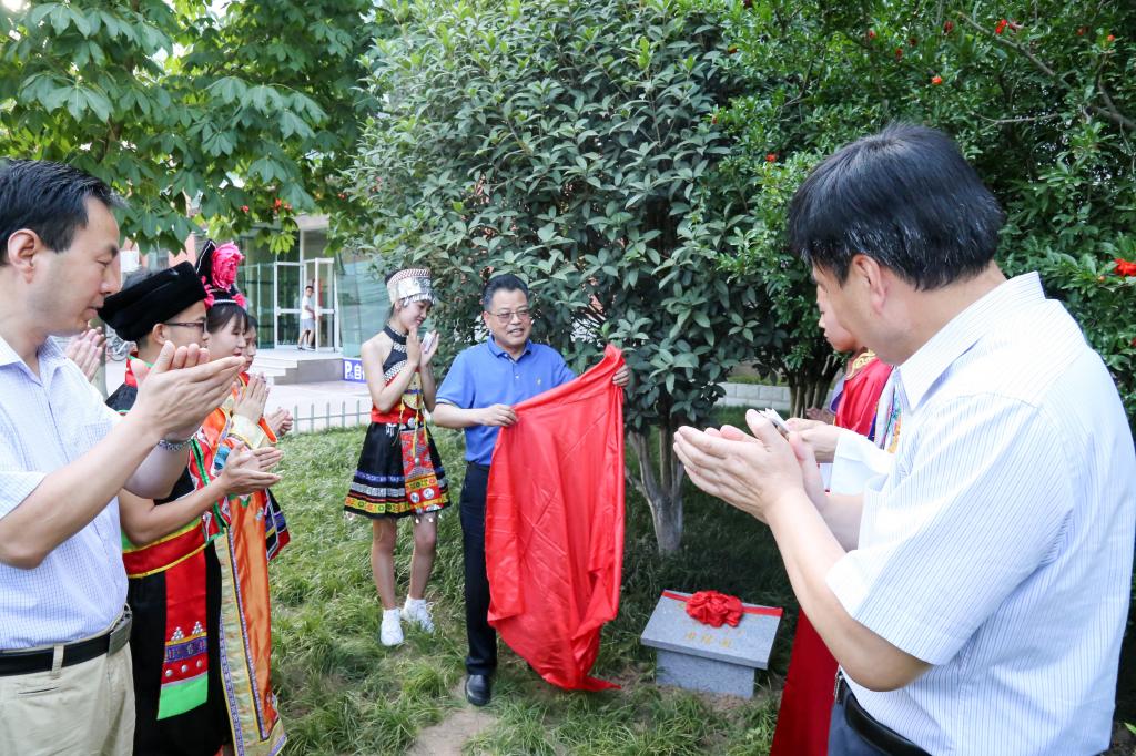 在展演开始前,栾宏在艺术楼前为宝鸡文理学院少数民族学生团结园揭幕,并与我校少数民族学生代表一起为“两个一百年”写下祝福,装入“时空瓶”内,放置在团结园中。