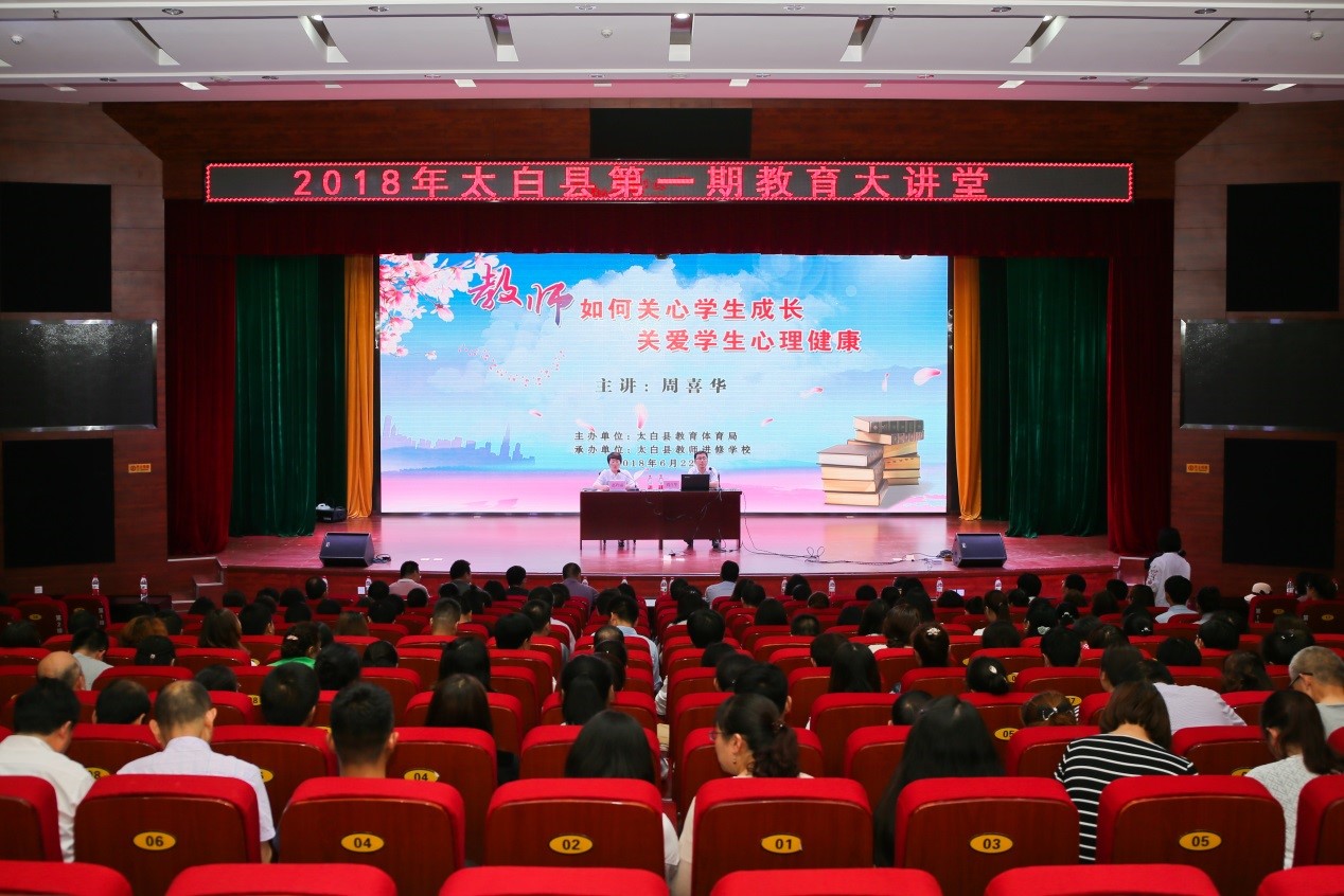 6月22日下午,按照我校与太白县结对帮扶方案,教育学院副院长周喜华教授做客太白县2018年第一期教育大讲堂,为太白县300多名中小学教师、校长和教育体育局全体干部作了题为《教师如何关心学生成长,关爱学生心理健康》的讲座。报告会由太白县副县长赵玲丽主持。