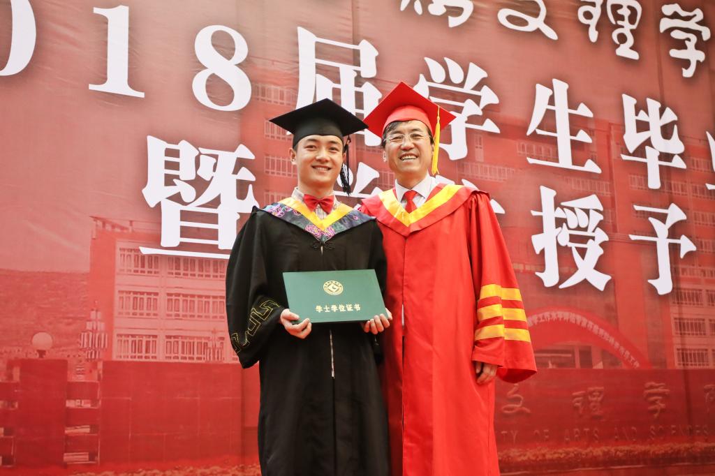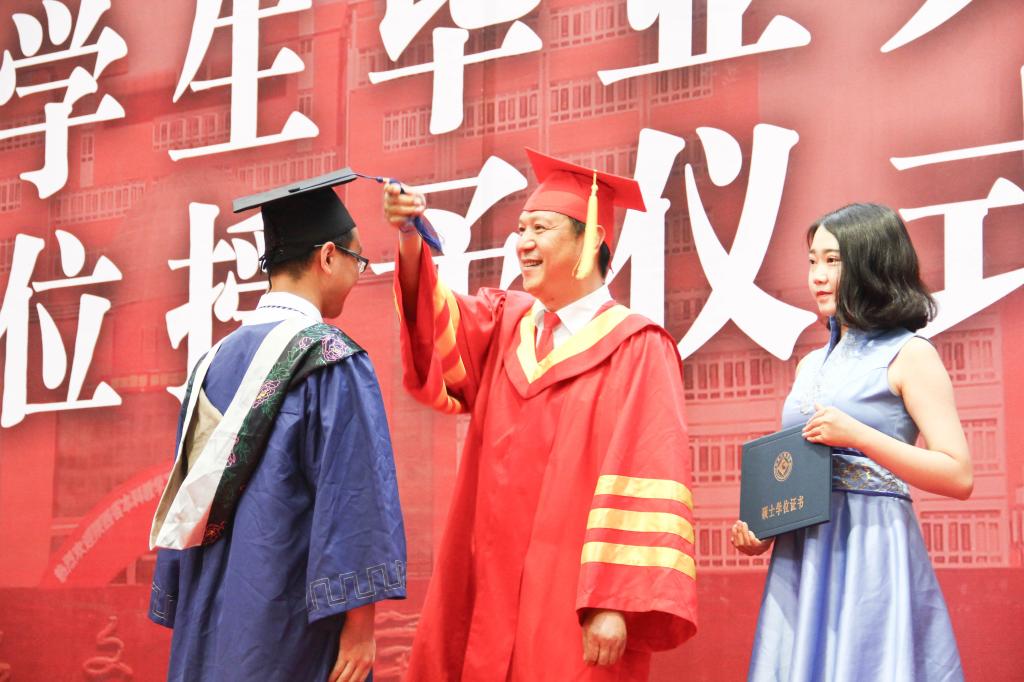 白黎、司晓宏为获得硕士学位、学士学位的毕业生代表扶正流苏、颁授学位证书。杨子元宣读2018届硕士研究生学位授予决定、本科生毕业资格审查结果和学士学位授予决定。王富平宣读优秀毕业研究生、优秀硕士论文获得者、优秀本科毕业生表彰决定。傅志军为研究生优秀毕业生和本科优秀毕业生代表颁发荣誉证书。段恒春为2018届校友联络员代表颁发聘书。