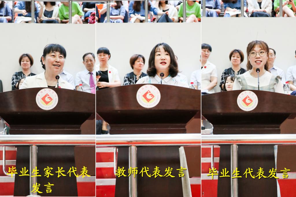 文学与新闻传播学院刘冰欣博士代表全体教师对圆满完成学业的2018届毕业生表示衷心祝贺,希望全体毕业生坚守理想、不忘学习、心怀感恩,大胆开启新生活,在新的岁月里直挂云帆,乘风破浪。不论走到哪里,也不论身处何方,母校的老师都会牵挂他们,祝福他们,做他们的坚强后盾。毕业生家长代表田静向四年来为孩子们健康成长付出无数辛劳的学校领导、老师表示最崇高的敬意和最衷心的感谢,向以优异成绩圆满毕业的同学们表示最热烈的祝贺,并祝愿学校桃李满芬芳,美名扬四海,早日建成高水平宝鸡大学。数学与信息科学学院2018届毕业生赵丹梦代表全体毕业生向辛勤培育他们的学校领导和老师表示最衷心的感谢和最崇高的敬意,并承诺他们一定会牢记师长们的殷切期望和深情嘱托,忠于祖国,忠于人民;立鸿鹄志,做奋斗者;求真学问,练真本领;知行合一,做实干家;在人生的道路上传承文理精神,继续书写母校荣耀,一路高歌理想、勤奋耕耘、肩负担当!