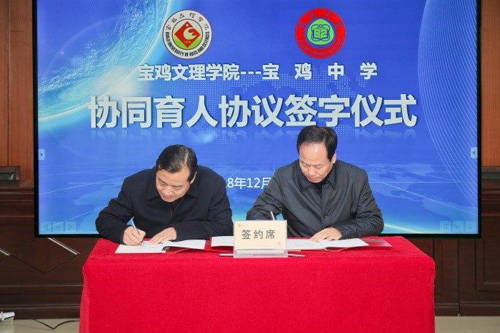 12月19日下午,我校与宝鸡中学协同育人合作协议签字仪式在宝鸡中学举行。副校长杨子元与宝鸡中学校长陈耀峰签署协同育人协议,教务处处长田延峰主持签字仪式。