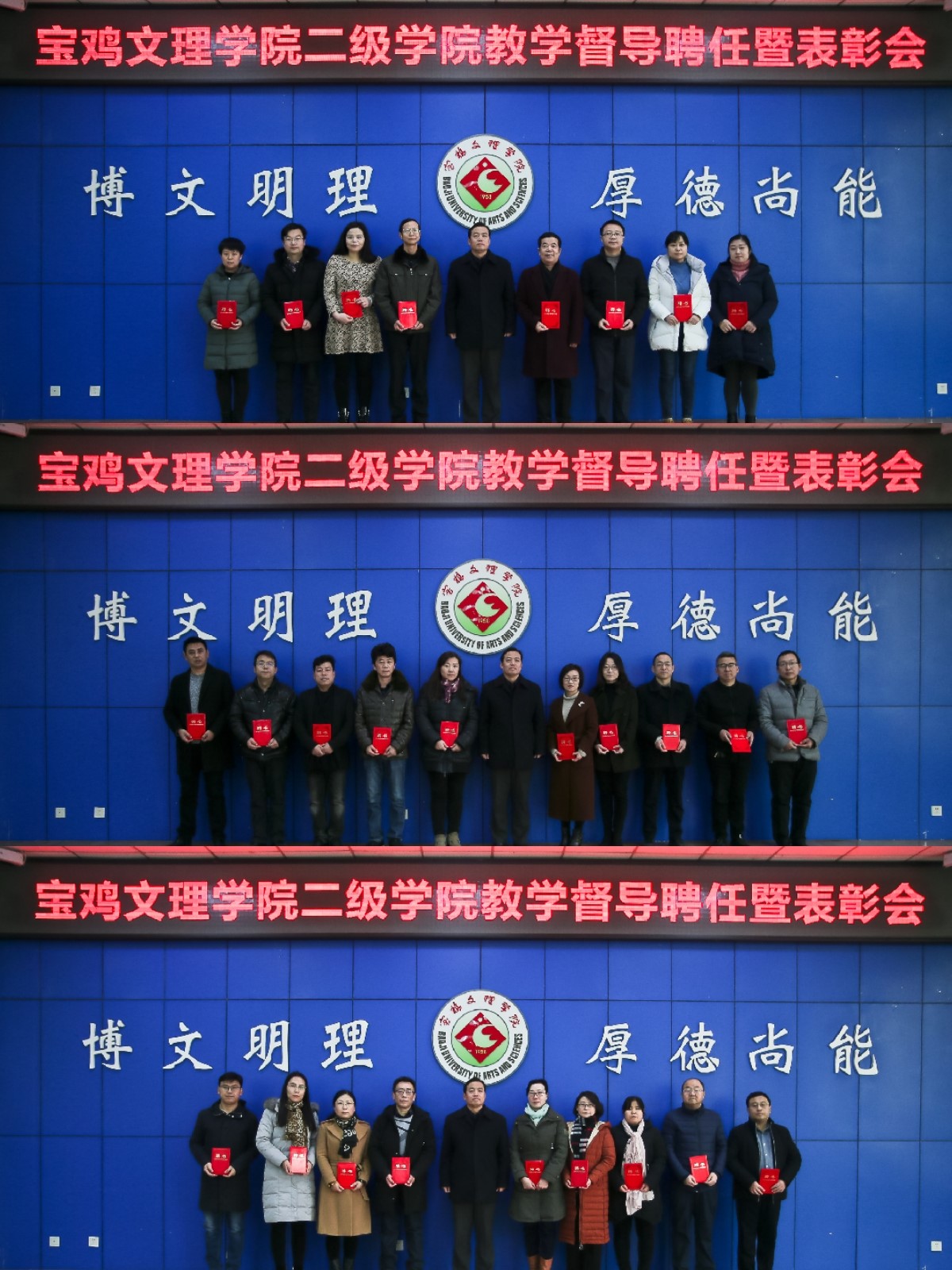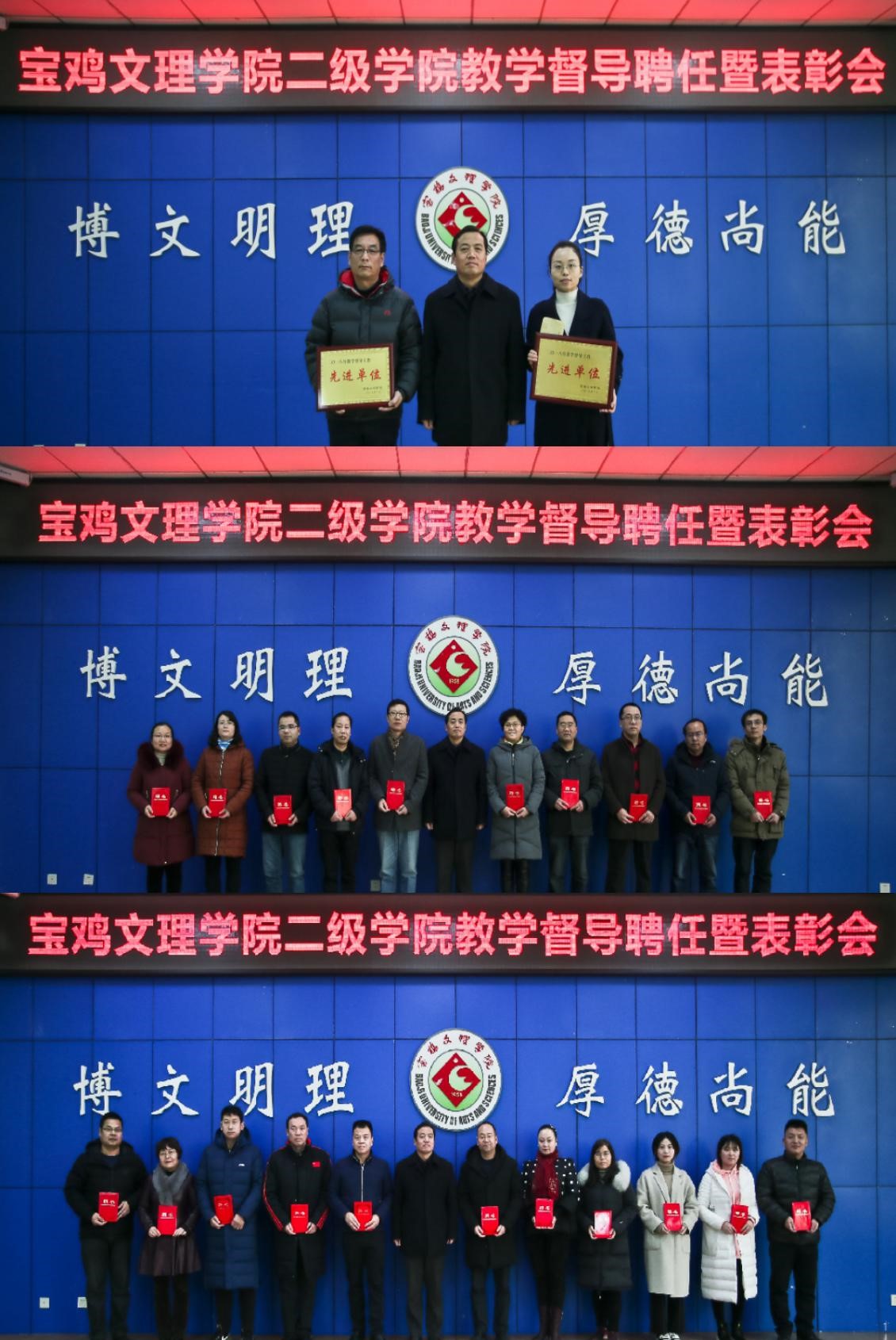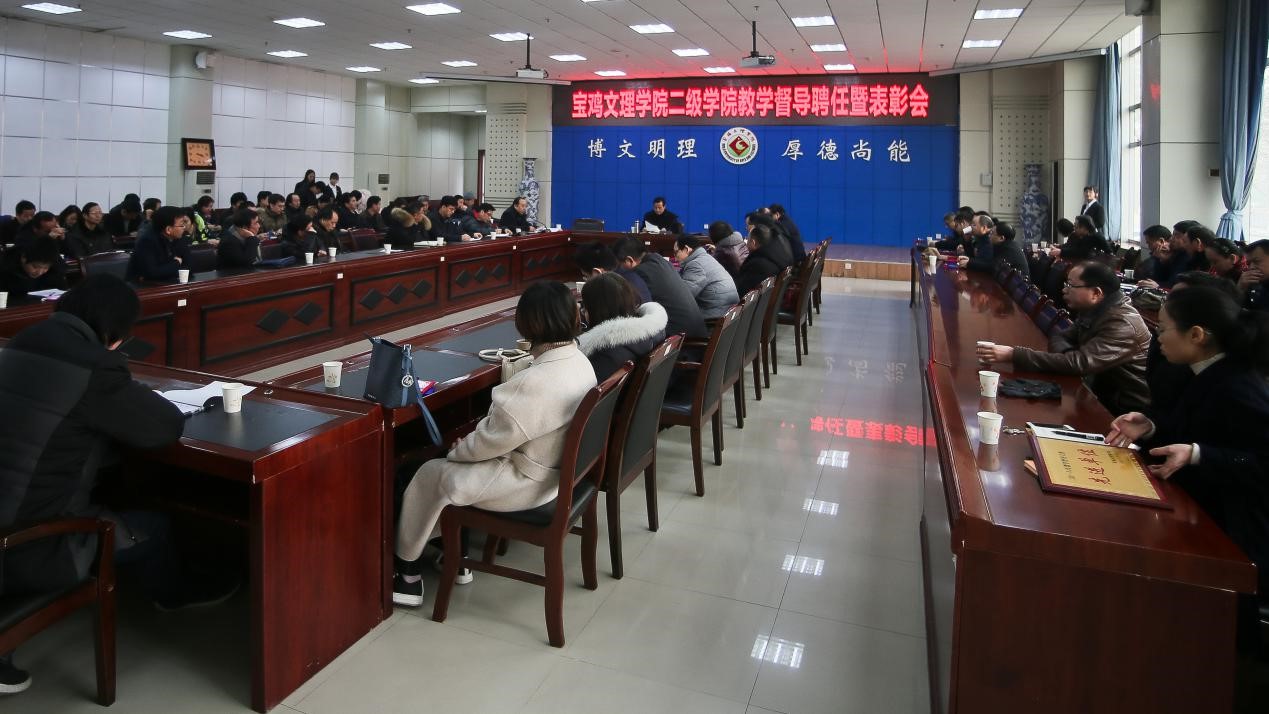 会上,教务处处长田延峰宣读了《宝鸡文理学院关于表彰2018年二级学院教学督导工作先进单位的决定》《关于聘任米文科等77位同志为二级学院教学督导的通知》。刘景世介绍了二级学院教学督导聘任及考评有关情况,安排了2019年教学督导工作。
