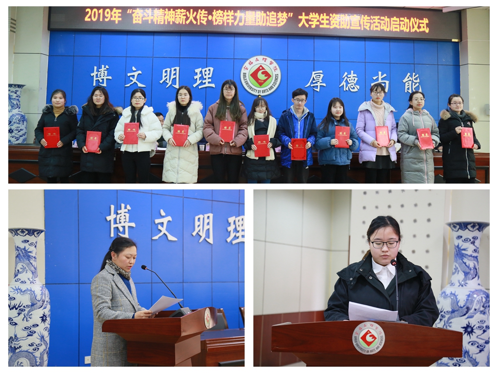 学生处副处长官莉萍宣读了《关于聘任张红婷等109名同学为“宝鸡文理学院学生资助宣传大使”的通知》《2019年学生资助宣传大使工作方案》,学生资助宣传大使代表秦羽彤同学向全体学生提出倡议,倡议同学们做资助政策的学习者、传播者和知恩感恩的践行者。