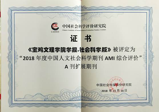 近日,《宝鸡文理学院学报》编辑部收到中国社会科学评价研究院发来的证书,《宝鸡文理学院学报·社会科学版》被评定为2018年度中国人文社会科学期刊AMI综合评价A刊扩展版期刊。这是宝鸡文理学院学报首次进入中国人文社会科学期刊A刊行列。