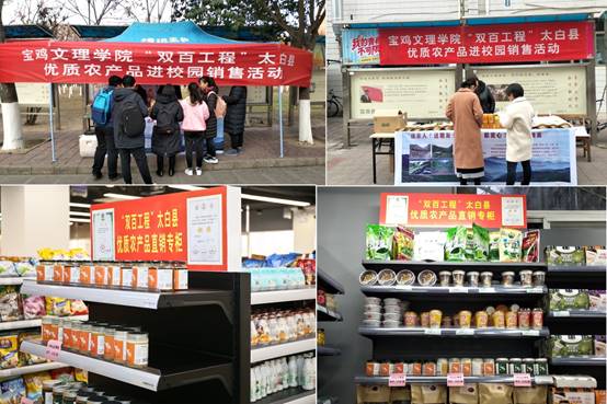 根据我校2019年“双百工程”帮扶计划安排,1月14日至16日,由校扶贫办、团委、后勤集团、陕西省太白林业局组织的宝鸡文理学院“双百工程”太白县优质农产品进校园销售活动在高新校区、石鼓校区食堂门口同步进行。同时,学校还依托高新校区、石鼓校区大学生超市开设了“双百工程”太白县优质农产品直销专柜,长期帮扶太白县产业发展,助力脱贫攻坚。