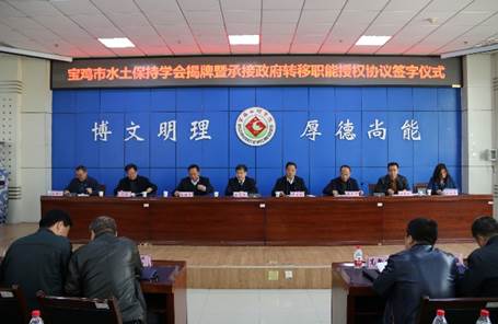 3月26日上午,宝鸡水土保持学会揭牌曁有序承接政府转移职能合作协议签字仪式在我校举行。副校长王富平、宝鸡市科学技术协会副主席辛省岐、市水利局副局长杨陆平、市生态环境局副局长张远闻等出席并致辞。