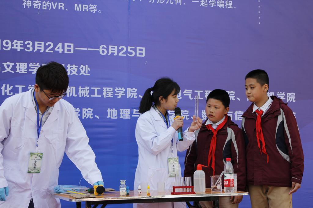 本次系列活动由科技处主办,化学化工学院承办,机械工程学院、电子电气工程学院、物理与光电技术学院、地理与环境学院、数学与信息科学学院、计算机学院协办。活动主要分“科学魅力大联系你我他”“大手拉小手点亮科学梦”“神秘科学世界百闻不如一见”三个板块。“科学魅力大联系你我他”板块主要是科技作品展示与交流,于3月25日至4月25日的每周日,在宝鸡龙廷山水西广场做现场演示与讲解,帮助广大市民朋友了解科学,提高科学素养。展示的主要内容有:微中见大、NI轮式移动机器人、六自由度教学型机器人、地质标本展、星球系统、手势识别仪、灯立方、梦幻点阵、穿墙而过、转盘摸彩、神奋数字、一起学编程、神奇的VR、MR等。“大手拉小手点亮科学梦”板块以走进中小学系列活动为主,常年不定期开展,内容有:科学大咖讲科学、制作彩虹、牛奶动画、灾害产生及预防、星球系统、三关节体感操作机械臂机器人、启智ROS机器人、智能拐杖、手机WiFi智能视频小车、锥体上滚、穿墙而过、神奇数字、分形几何、一起学编程、神奇的VR、MR等,通过讲解和互动体验,帮助培养学生学科学、爱科学的兴趣,激发学生的创新创造能力。“神秘科学世界百闻不如一见”板块主要通过开放校内部分实验室,主要内容有:“我思考、我实验”、神奇世界、我和机器人做朋友。
