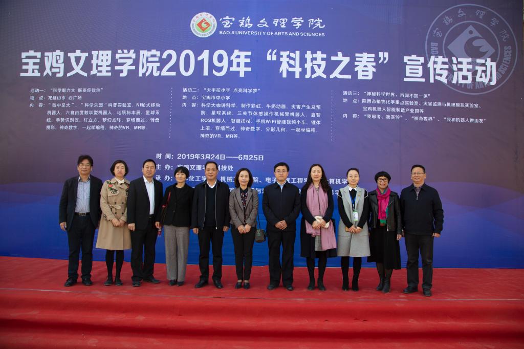 3月31日,我校2019年“科技之春”宣传月系列活动启动仪式在宝鸡市龙廷山水西广场举行。副校长李景宜、宝鸡市科技局副局长闫明辉、宝鸡市科学技术协会副主席辛省岐、高新区科技局局长王敬青、宝鸡龙廷山水地产招商运营总经理袁泽、宝鸡宏宝升教育科技有限公司总经理陈红等出席启动仪式。