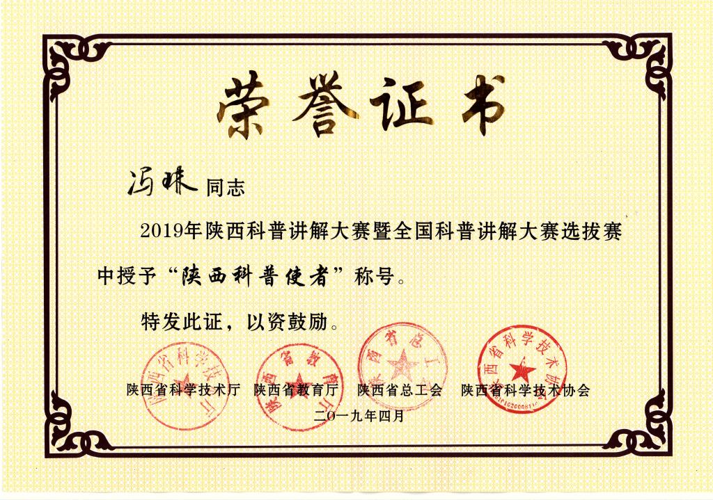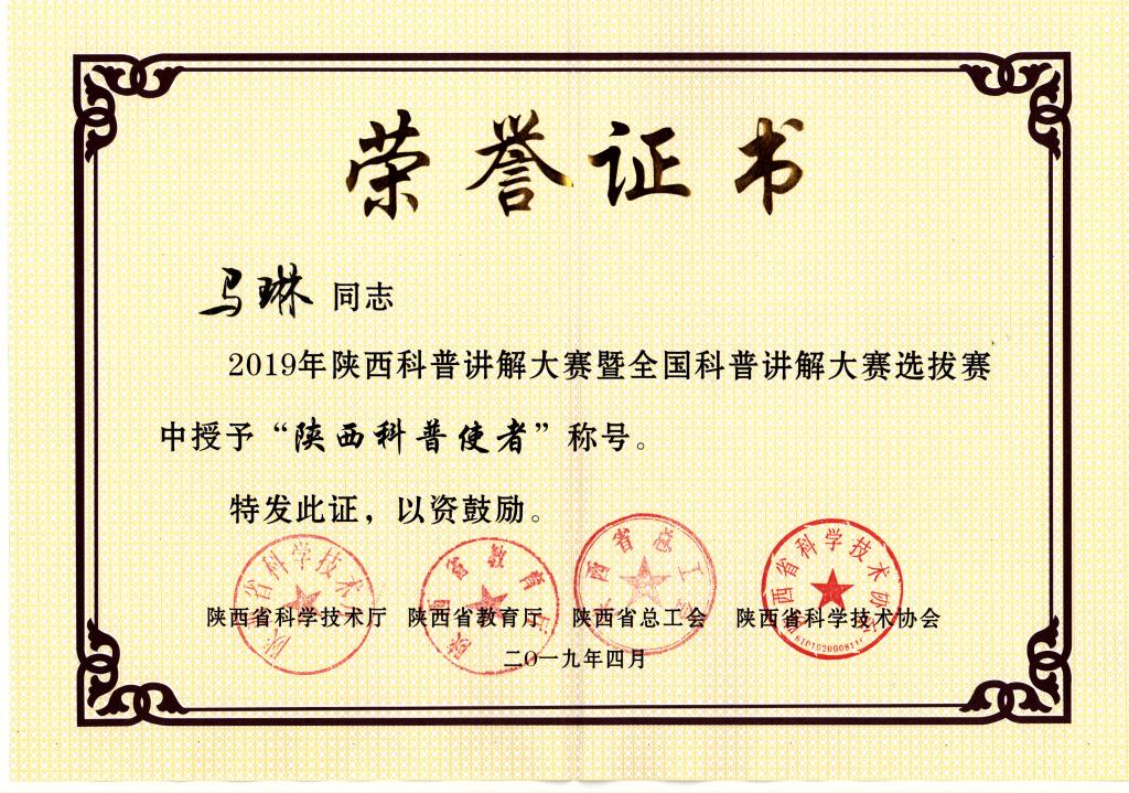4月17日至18日,2019年陕西省科普讲解大赛暨全国科普讲解大赛选拔赛在陕西科技资源统筹中心举行。我校共选派4名选手参加比赛,经过激烈角逐,化学化工学院教师马琳、历史文化与旅游学院学生冯琳分别获得“陕西科普使者”称号。