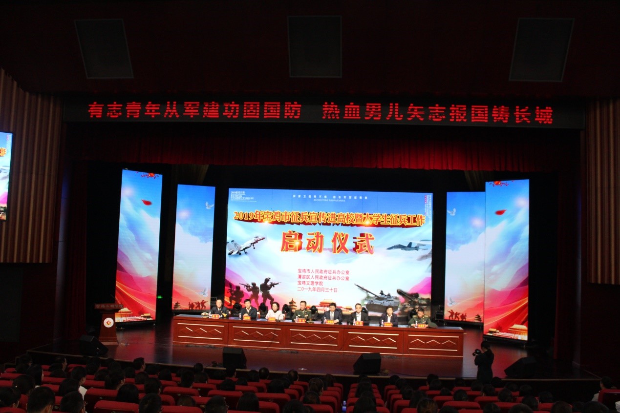 4月30日上午,2019年度宝鸡市大学生征兵宣传暨征兵工作启动仪式在我校博文楼报告厅举行,宝鸡市委常委、副市长曾德超,宝鸡市军分区司令员张炜及渭滨区有关领导参加启动仪式。校党委副书记栾宏出席仪式并讲话。