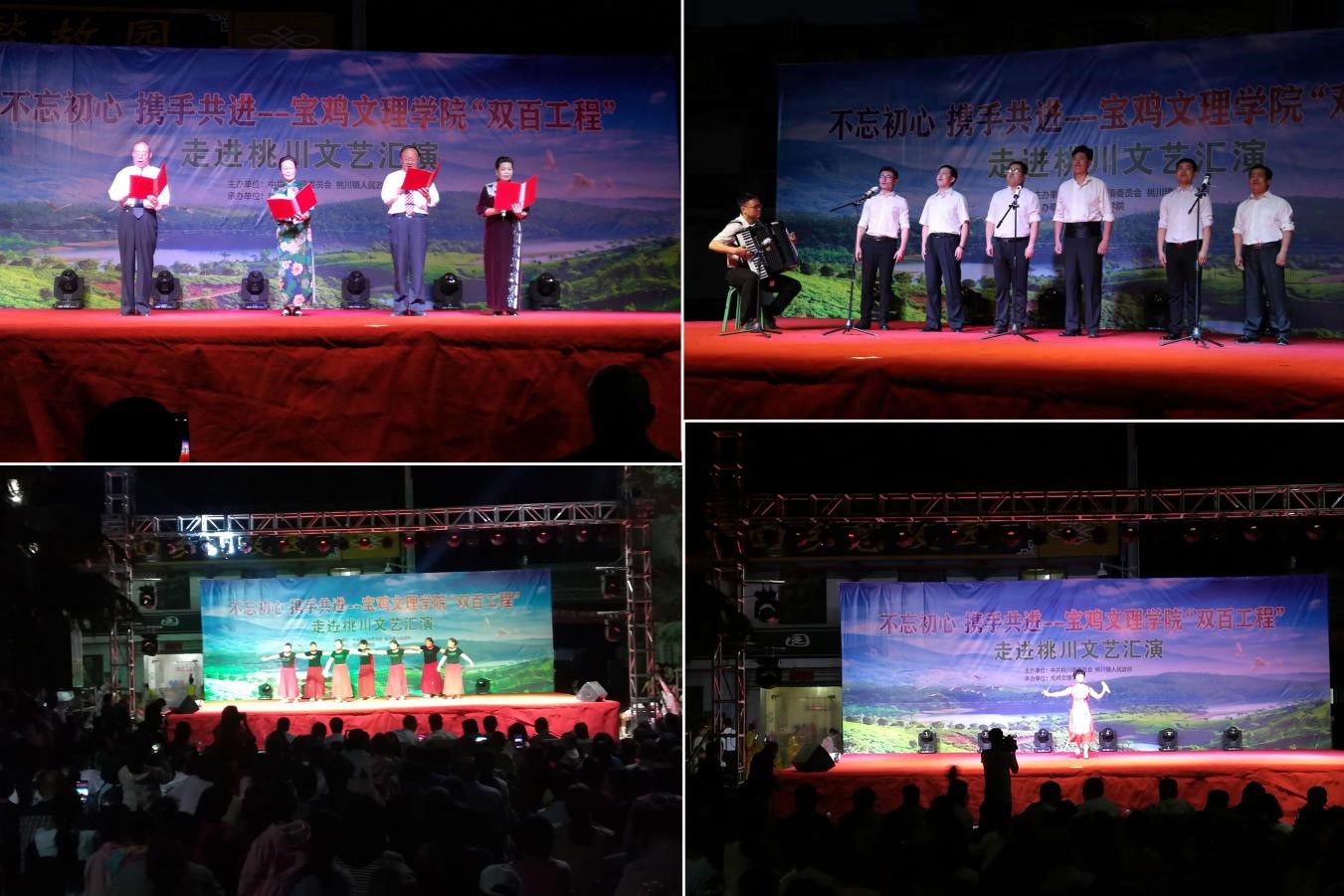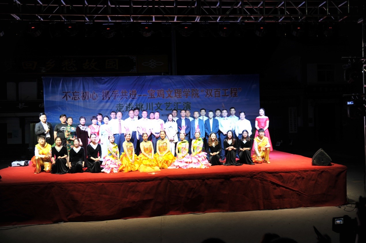 7月12日晚上8点,“不忘初心·携手共进”—宝鸡文理学院“双百工程”走进桃川文艺汇演晚会在桃川镇镇政府驻地灵丹庙村举行。整场晚会围绕对祖国的美好祝愿和激励广大干部群众撸袖实干脱贫致富这条主线,音乐学院、离退处师生和桃川镇文艺爱好者为广大群众献上小合唱、舞蹈、民乐小合奏、器乐合奏、诗朗诵、秦腔、三句半、独唱、歌伴舞9类18个节目。其中,离退处老教师们深情朗诵的《脱贫攻坚太白情》经典原创,回顾了我校两年来“双百工程”帮扶情况,表达了校地双方在脱贫攻坚战中结下的浓浓帮扶情,桃川镇当地群众表演的舞蹈《站着等你三千年》《前世今生缘》和三句半《礼赞桃川》用别样的艺术形式展现了桃川人民良好的精神风貌,表达了老百姓对美丽桃川未来发展的美好期望和对我校帮扶工作的肯定。晚会在歌伴舞《不忘初心》催人奋进的曲调中结束,再现了共产党人不忘初心、牢记使命,继续前行的坚定决心和高度自信。太白县人大、教体局、桃川镇政府相关领导和近千余名群众观看了文艺汇演晚会。
