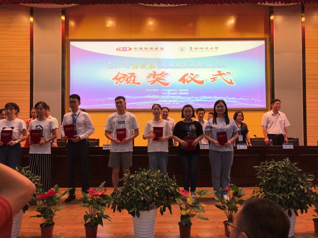 近日,基于师范专业认证的物理学科育人论坛暨第十一届“格致杯”物理师范生教学技能交流展示活动在阜阳师范大学西湖校区举行,我校物理与光电技术学院选拔四名本科生和两名研究生参加教学技能展示比赛。通过前期近两个月有效的专业技能训练,我校学生喜获佳绩,其中,2016级物理学专业戚文韬获本科生教学技能比赛一等奖,荆雪茹获二等奖,王轩、张明悦获赛三等奖;2018级学科教学(物理)专业戴嘉良获研究生教学技能比赛一等奖,朱柯芹获三等奖;沈亦红、冯青荣获优秀指导教师。