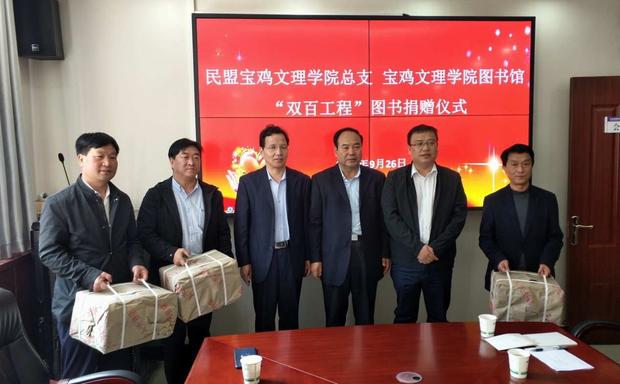 9月26日上午,在校扶贫办的大力支持、协助下,图书馆党总支联合中国民主同盟宝鸡文理学院总支、北京蔚蓝公益基金会向太白县咀头初级中学、咀头小学、黄凤山小学3所学校捐赠了价值2.5万元的图书,并在太白县教育体育局举行了捐赠仪式。图书馆党总支书记刘崇学,太白县副县长侯伟强,民盟宝鸡市委副主任委员、民盟宝鸡文理学院总支主任委员、图书馆副馆长康江峰参加捐赠仪式,捐赠仪式由太白县教育体育局局长陈军礼主持。