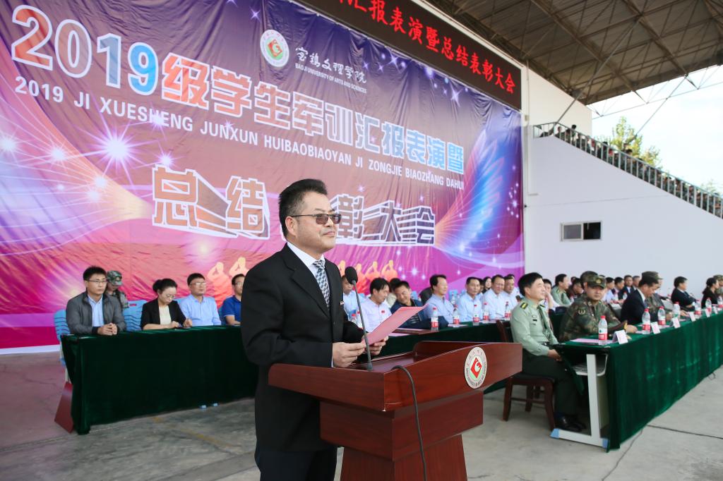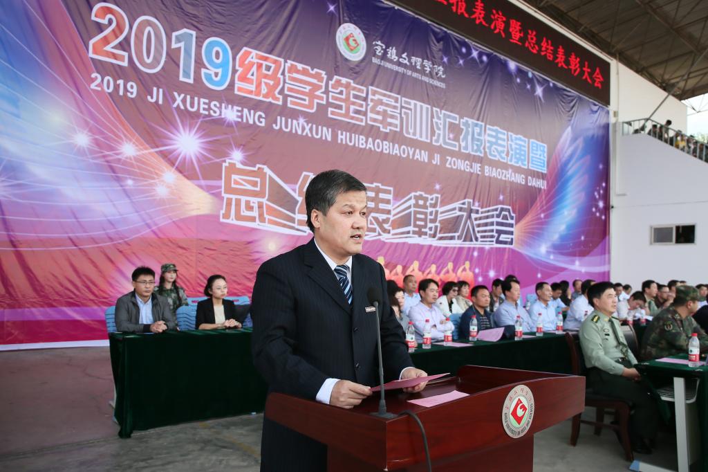 党委副书记、军训领导小组组长栾宏作了总结讲话,他向96607部队全体承训教官的辛勤付出表示衷心的感谢,向全体参训干部和同学们表示亲切的慰问,并向军训中取得优异成绩的先进集体和个人表示热烈的祝贺。他指出,军训期间,2019级新生所表现出的吃苦耐劳精神、团结协作意识充分展现了新时代青年的风采。承训教官以饱满的政治热情、良好的精神风貌、认真负责的工作态度、纪律严明的军人作风影响并感染着每一位新同学,为我校的人才培养做出了重要贡献。全体学工干部与教官们密切配合,把严格的管理同深入细致的思想政治工作融为一体,为军训的圆满完成奠定了良好的基础。他同时对我校今年学生军训工作的创新举措,对教学、管理、后勤等有关部门、全体参训教师在工作过程中展现出的大局意识、团结意识、奉献意识和创新意识予以了充分肯定。他希望全体新同学牢记党和人民的嘱托,继续发扬军训精神,弘扬学校优良传统,珍惜时光,勤奋学习,立德修身,立心逐梦,不断迎接人生新的征程、新的挑战。