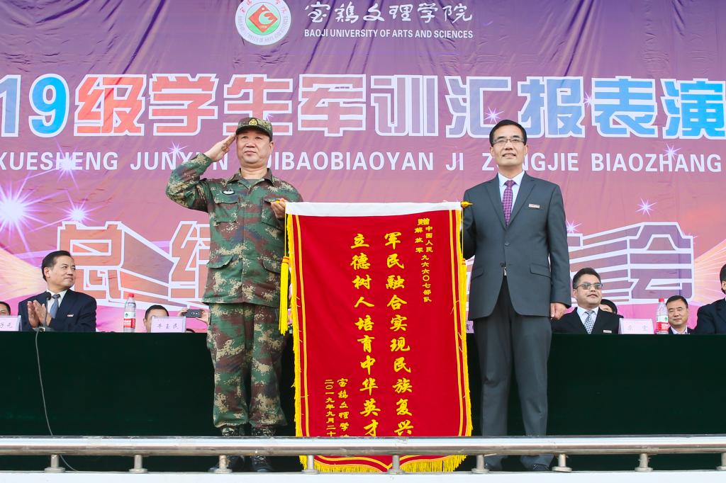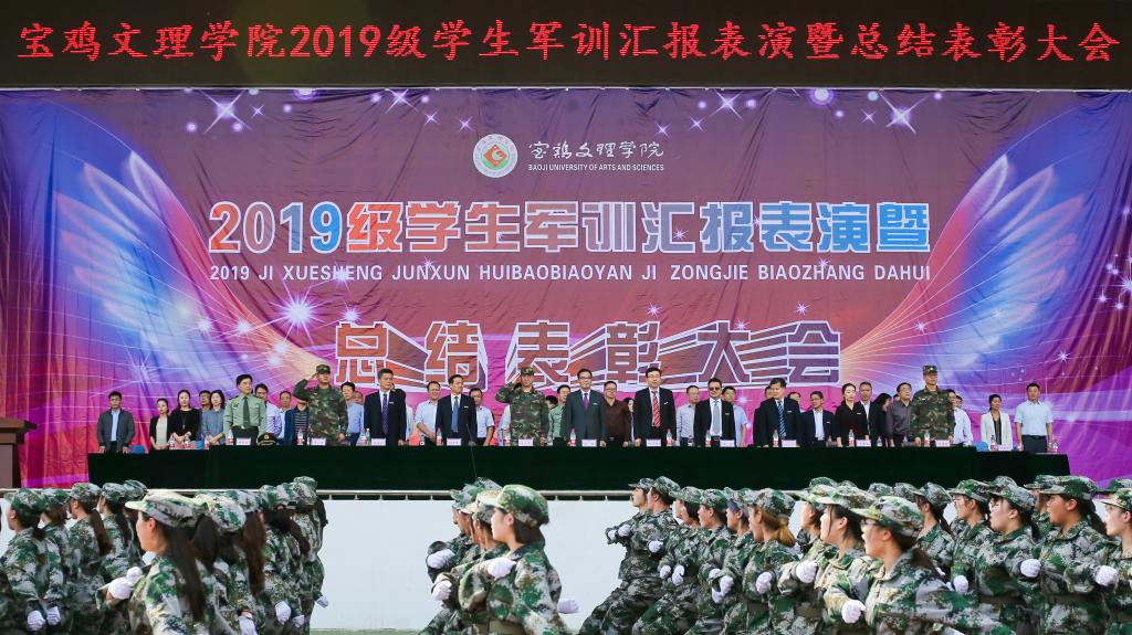 9月20日下午,我校2019级学生军训汇报表演暨总结表彰大会在高新校区体育场举行。校党委书记赵健、校长郭霄鹏、党委副书记栾宏、副校长王富平、纪委书记段恒春、副校长李景宜以及中国人民解放军96607部队副参谋长牛玉民大校、苏旭中校,中国人民解放军96872部队副团长李海庆中校出席大会并在主席台就座。各二级学院党政领导、相关职能部门负责人、2019级全体本科学生以及军训团全体干部参加了大会。大会由副校长杨子元主持。