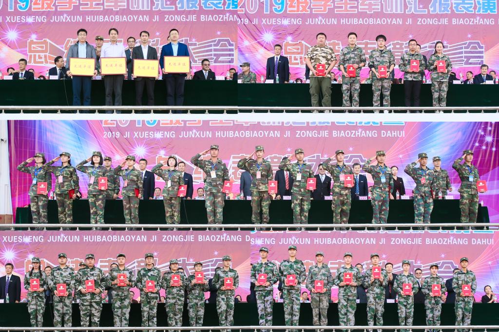 王富平宣读了军训表彰决定,对4个先进集体和赵京京等182名军训先进个人予以表彰,学校领导及部队首长为先进集体及先进个人代表颁发奖牌和证书。