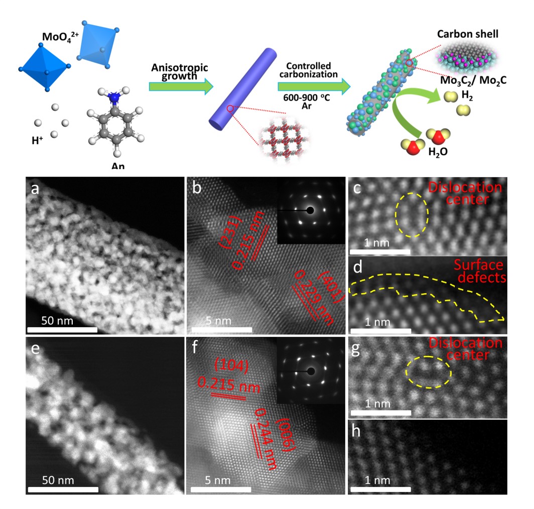该工作创新性地利用材料相变的规律,精准的控制材料表界面处的缺陷结构,实现了具有极高协同效应、高活性的新型Mo2C-Mo3C2异质纳米电催化材料。研究结果表明,设计电催化剂在在酸性和碱性介质中均表现出最佳的电催化活性:在10 mA cm-2电流密度下的过电势分别为134 mV和116 mV,具有小的塔菲尔斜率(64 mV dec-1),以及长期稳定性。这一研究成果对设计和制备高活性电催化剂材料具有重要指导意义,对非贵金属纳米级界面工程的工业水分解领域电催化剂的设计提供新的见解。该工作的发表不仅标志着我校与重庆文理学院的联合培养研究生工作进入一个新的阶段,也标志着我校光学工程专业的研究生培养水平逐步提高。(学科建设与研究生教育管理处、物理与光电技术学院 文/董宇 图/贾丽娜 审核/赵天绪、钱郁)