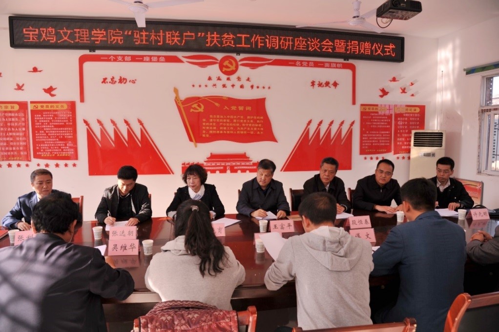 校领导一行与千阳县副县长杨军辉,县扶贫办、水沟镇政府等单位负责人以及纸坊沟村村组干部、部分群众进行座谈交流。