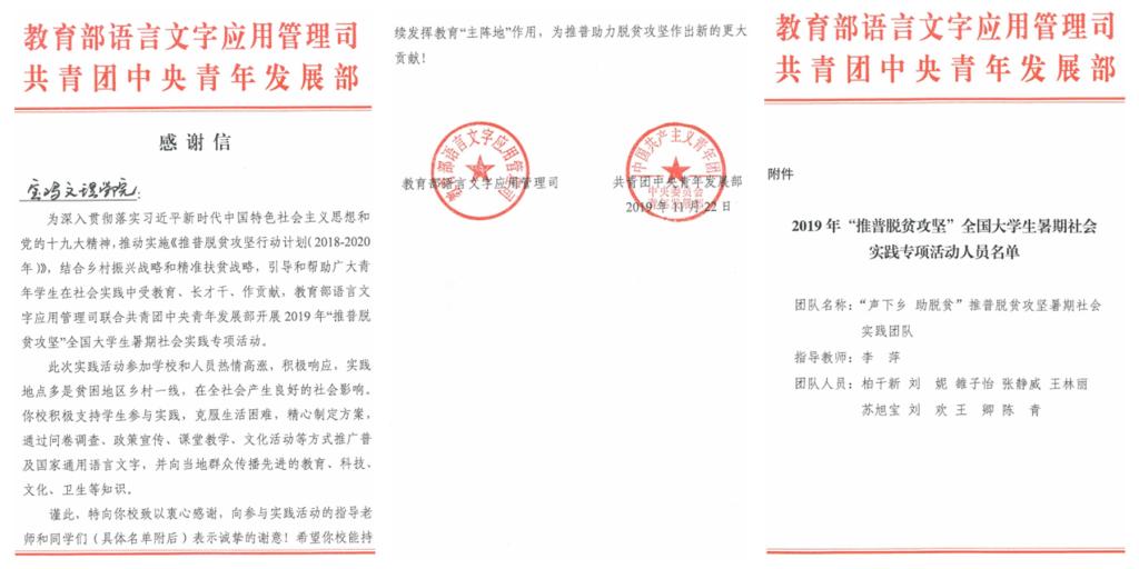 近日,教育部语言文字应用管理司和共青团中央青年发展部联合向我校发来感谢信,感谢我校对2019年“推普脱贫攻坚”全国大学生暑期社会实践专项活动的大力支持,肯定我校“积极支持学生参与实践,克服生活困难,精心制定方案,以推广普通话助力脱贫攻坚为主线,通过交流座谈会、政策宣讲会、课堂教学、文化活动等方式,在推广普通话的同时向当地群众传输先进的教育、科技、文化、卫生等知识”方面做出的贡献,并对团队指导老师及学生的辛勤付出予以表扬。