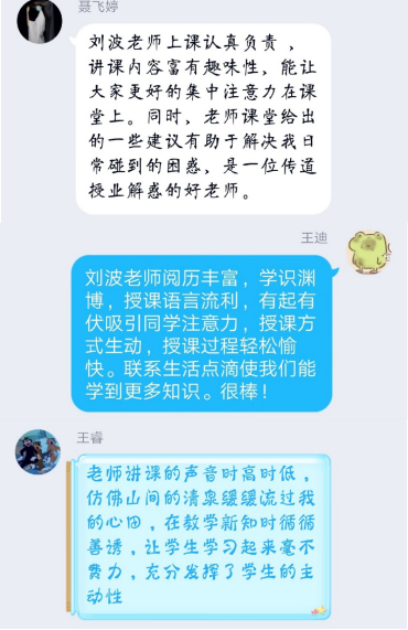 “老骥伏枥志千里、发挥余热成网红”。刘老师自谦地说,通过一周的在线教学,自觉羞愧,平时习惯于读书写东西,对网络技术学习不够,给学院的正常教学添了麻烦,直到现在还做不到很熟练流畅,有些甚至走了很大的弯路。听完刘老师的网络直播课,2017级经济学专业王迪同学说,“刘老师阅历丰富、学识渊博,授课语言流利,有起有伏吸引同学注意力,授课方式生动,授课过程轻松愉快。联系生活点滴使我们能学到更多知识。很棒!”王睿同学说,“老师讲课的声音时高时低,仿佛山间的清泉缓缓流过我的心田,在教学新知时循循善诱,让学生学习起来毫不费力,充分发挥了学生的主动性”。聂飞婷同学说,“刘老师课堂给出的一些建议有助于解决我日常碰到的困惑,是一位传道授业解惑的好老师”。