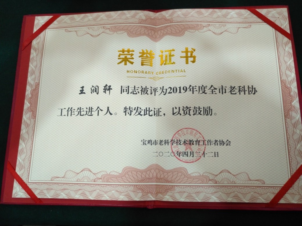 会上,市老科协对宝鸡市及各县区36个先进集体、76名先进个人进行了表彰。宝鸡文理学院老科协荣获2019年度先进集体荣誉,我校老科协理事王润轩教授荣获先进个人称号。