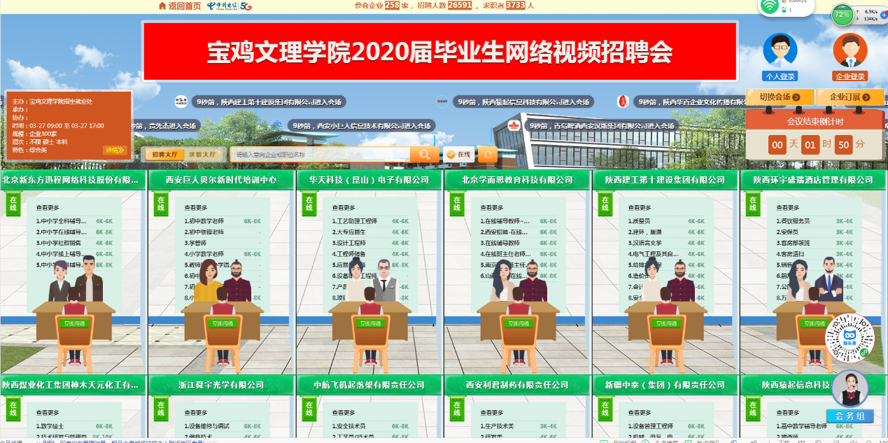 本次网络视频招聘会引起了各用人单位和毕业生的广泛关注,据统计,共有来自北京、河北、山东、江苏、安徽、上海、浙江、广东、四川和陕西等全国多个省(市)的258家企业参会,提供岗位1328个,需求人数26593人。3754名来自省内多所高校的毕业生参会,其中我校学生2999人,投递简历7453人次。