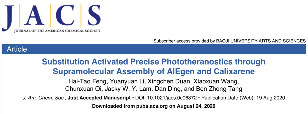 我校AIE(聚集诱导发光)研究中心、陕西省植物化学重点实验室、化学化工学院冯海涛博士时隔三个月,继Nature子刊Nature Communications和Journal of the American Chemical Society(简称JACS)之后,又在国际顶级期刊JACS上发表题为“Substitution Activated Precise Phototheranostics through Supramolecular Assembly of AIEgen and Calixarene”的学术论文。论文第一作者和通讯作者为冯海涛博士,我校是第一通讯及署名单位,南开大学丁丹教授和我校AIE研究中心名誉主任、香港科技大学唐本忠院士为论文共同通讯作者。