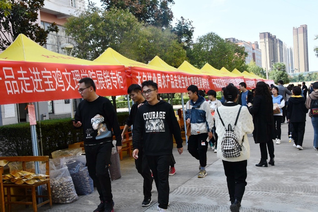 10月16日至17日,校扶贫办联合团委在高新校区举办了第三届“团团大集”—帮扶县区优质农产品进校园推介销售活动。来自太白县、镇安县、千阳县、凤翔县、陇县等县区的11家农业合作社带来了当地生产的太白土蜂蜜、核桃、木耳、香菇、花椒、熊猫豆,千阳苹果、荞面饸饹、苦荞挂面、土鸡蛋、刺绣,镇安魔芋、腊肉、板栗、各类干果等品种丰富的农产品。这些农产品新鲜优质,货真价实,深受师生欢迎,部分学生还通过抖音视频直播带货方式进行推介,现场气氛热烈,销售火爆。师生参与热情高,自愿选购农产品支持贫困群众,以实际行动助力打赢脱贫攻坚战。该活动也邀请了宝鸡市网红公益联合会参加。据了解,活动现场销售农产品达2.6万余元。同时,学校在与太白县签订2020—2021年度消费扶贫协议的基础上,还坚持每周星期二和星期五组织太白高山蔬菜进校园销售活动,为教职工提供常态化服务,方便师生生活。