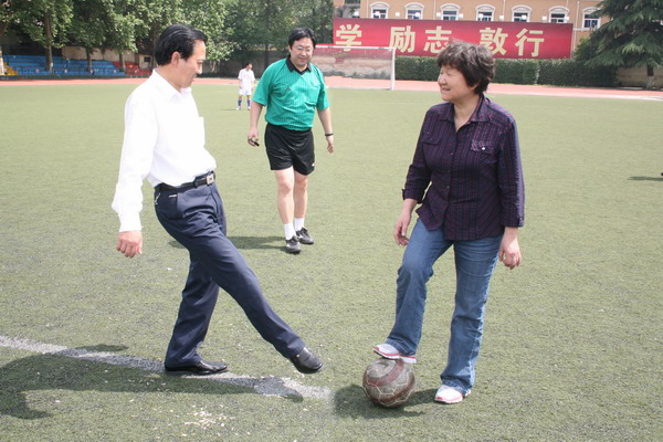 为了加强与兄弟院校的相互了解和增进友谊,应陕西师范大学工会的邀请,5月23号下午,我院教职工足球队与陕西师范大学教职工足球队进行了一场友谊赛。赛前,陕西师范大学党委副书记武国玲会见了我院足球队一行,院长王志刚、陕西师范大学党委副书记武国玲一起为比赛开球。陕西师范大学工会主席李磊、我院工会副主席刘锡让分别发表了热情洋溢的讲话。