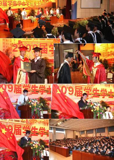 6月11日到6月18日,我院以系部为单位举行了2009届学生学士学位授予仪式。院长、院学位委员会主席王志刚,副院长、院学位委员会常务副主席傅志军,副院长、院学位委员会副主席赵荣侠,教务处处长杨子元,高教研究室主任、教务处副处长田延峰,教务处副处长孙新和各系党总支书记、系主任以及各系其他领导、部分教师、2009届本科生毕业生、部分在校生代表参加了学士学位授予仪式。