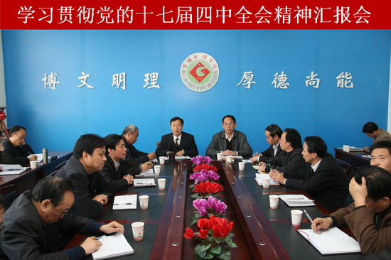 11月5日,学院在新校区第一会议室召开学习贯彻党的十七届四中全会精神汇报会。院党委书记赵怀礼出席会议并作重要讲话。党委各部门负责人、各党总支书记参加了会议。汇报会由院党委副书记李全武主持。