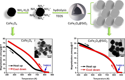 CoFe2O4纳米颗粒在信息存储、磁流体、电子器件和生物医药体系等多个技术领域应用广泛。但CoFe2O4属于软磁材料,因其磁相互作用力的存在导致纳米颗粒极易团聚,会引起高温磁测量误差。本研究用无定形SiO2包覆CoFe2O4纳米颗粒形成CoFe2O4@SiO2核壳结构纳米复合颗粒,调研了这种核壳结构复合纳米颗粒的高温磁性能(300 K~830 K),发现在高温下CoFe2O4@SiO2核壳结构复合纳米颗粒表现出非常有序的磁性行为,预示着该种核壳结构复合纳米颗粒可广泛应用于高温条件下。研究发现这是由于SiO2具有熔点高、化学稳定性好及无毒无害等诸多优点,作为壳层包覆CoFe2O4纳米颗粒可有效阻止其纳米颗粒在高温磁测量时发生团聚及生长,避免测量错误,特别是居里温度(Tc)。该研究论文系铁电功能材料工程技术研究中心校企合作产业化课题的阶段性理论成果,该成果为提高磁性纳米颗粒高温磁测量的准确性提供了新的思路。(科技处、化学化工学院 文/田梅娟)