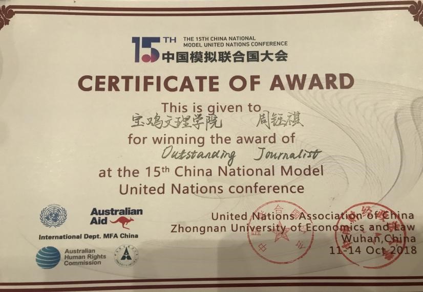 10月11日至14日,由中国联合国协会主办的第十五届中国模拟联合国大会在中南财经政法大学举行,来自北京大学、国防科技大学等全国近200所知名高校的500余名师生参加了大会,联合国秘书长古特雷斯先生专门为大会发来致辞视频。我校文学与新闻传播学院2016级校学生模拟联合国协会负责人王东宇受邀参会,外国语学院2015级学生周钰祺参加大赛荣获大会“杰出记者奖”。本次模联大会首次以全英文形式作为本次会议的交流语言,我校学生在场上以清晰的思维,切实的政策主张及精准的表达,赢得了大会主席和评委的一致认可和高度赞扬。