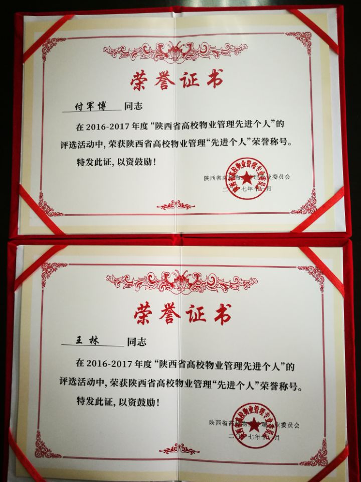 11月23日,在2016-2017年度陕西省高校物业管理专业委员会年会先进集体和先进个人评选活动中,后勤公司物业中心主任付军博、后勤集团物业中心副主任王林两名同志被评为陕西高校物业管理先进个人。(后勤集团 文、图/刁艳)