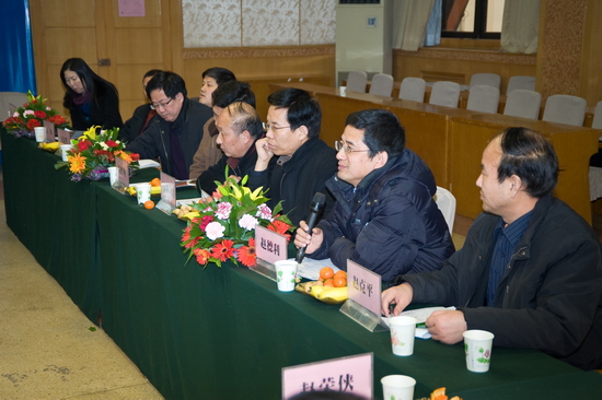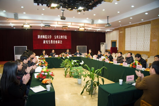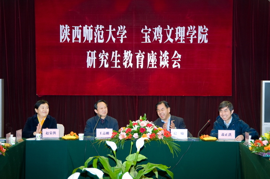王志刚院长在座谈会上讲了四句话。第一,宝鸡文理学院与陕西师范大学有着特殊的血缘关系,在五十多年发展历程中的每一个关键时刻都得到陕西师范大学的无私援助与关心支持,特别是学院在今天发展的重要时刻,两校联合召开研究生教育座谈会,对陕师大再一次给予的支持,宝鸡文理学院铭记在心;第二,在2009年刚刚结束的硕士、博士学位授权审核过程工作中,宝鸡文理学院成为陕西省唯一一所硕士学位授权立项建设高校,这就意味着经过三年的建设期并通过国务院学位办与省学位办验收合格后可以正式开始研究生教育工作,这对宝鸡文理学院具有里程碑意义,使学院在本科教育层次的基础上实现研究生教育,又一次站在了新的历史起点上。要在两年后实现这一目标,培养历练硕士生导师队伍是重要环节,能得到陕师大及时的支持帮助表示非常感谢;第三,宝鸡文理学院硕士学位授权立项建设高校的建设期只有三年,时间短、任务重,对我们来说是考验与挑战。这需要我们进一步提高学科实力与科研水平,在方向、队伍、平台、学科特色、条件等方面不断加大力度,创造条件。面对差距,特别是硕士生导师队伍建设方面,我们需要学习和锻炼,本次我们初步选拔了28名科研水平高的教授参与到陕西大的硕士生培养工作中,希望通过和陕西师范大学实质性的合作,不断积累研究生的教学经验,同时也能使我院研究生导师队伍逐渐形成,并为三年后独立培养研究生创造条件;第四,在岁末年初的特殊时期,我院一行专程拜会陕西师范大学各位领导和老师,对多年来的帮助和即将开展工作的支持再次表示感谢。