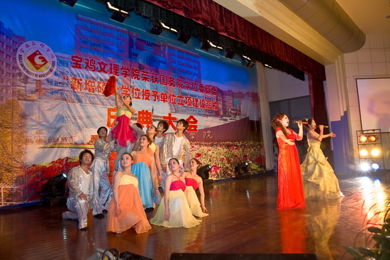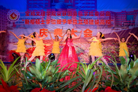 锣鼓阵阵,彩旗飘飘,鞭炮齐鸣,全院师生员工无不欢欣鼓舞,校园洋溢着一派欢乐、祥和、喜悦的氛围。4月15日下午,学院在新校区音乐厅隆重召开荣获国务院学位委员会新增硕士学位授予单位立项建设高校庆典大会。陕西省学位委员会秘书长、省学位办孙朝主任,宝鸡市人民政府副市长刘桂芳以及院党委书记赵怀礼,院长王志刚,党委副书记米晓东、李全武,副院长傅志军、王普藩、赵荣侠出席了会议。庆典大会由赵荣侠主持。