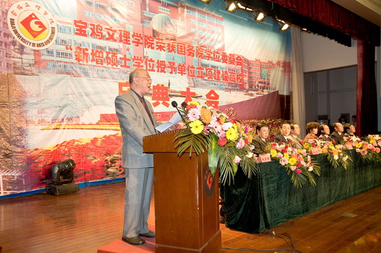 陕西省学位委员会秘书长、省学位办孙朝主任和宝鸡市人民政府刘桂芳副市长发表了热情洋溢的讲话。孙主任首先代表省学位委员会、省教育厅、省学位办向宝鸡文理学院表示热烈的祝贺和诚挚的慰问。他说,宝鸡文理学院今天获得这一殊荣,凝结着几代文理人艰辛的探索、孜孜不倦的追求与竭尽全力付出的心血与汗水,确属来之不易! “十五”开始,学院启动了申硕工作,加大了学科建设力度,进一步凝炼学科方向,优化学科队伍,夯实学科平台,活跃学术交流,构建了学科建设工作新机制,校地合作亦明显加强,学科实力和水平显著提升。这些显著成绩的取得无疑为成功获批为国务院学位委员会“新增硕士学位授予单位立项建设高校”奠定了坚实的基础,也为学院跨越式发展创造了条件。孙主任对新增硕士学位授予单位立项建设工作提出了要求与希望:第一,要高度重视,全力以赴。第二,要加大学科建设力度,快速推进立项建设各项工作。第三,要不辱使命,保证高质量、高水平完成立项建设的各项任务,顺利通过检查验收,获得硕士学位授予权并开展研究生教育,为地方经济建设和社会发展做出更大贡献。