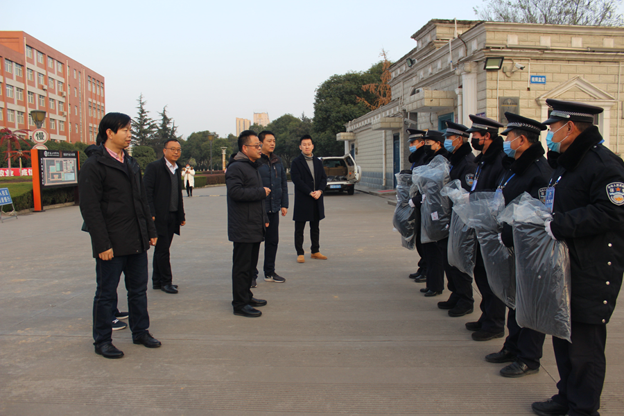 栾宏一行检查了高新校区图书馆北门、高新校区北门、石鼓校区南门、美仑小区、文理新村等地校园安全保卫工作的落实情况,对坚守岗位、辛勤工作、无私奉献的全体校卫队员表示亲切慰问和衷心感谢,并为校卫队员送去了崭新的防寒大衣。