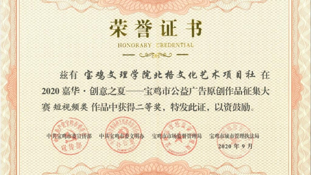 近日,“2020嘉华.创意之夏--宝鸡市公益广告原创作品征集大赛”落下帷幕,我校选送的公益广告作品《归来》获得短视频类二等奖。