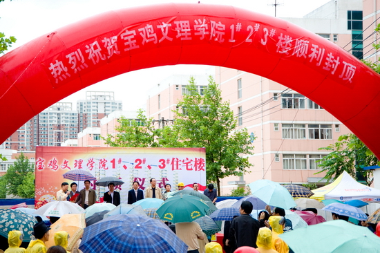 封顶仪式上,院长王志刚宣布高层住宅楼工程主体封顶,参会领导和嘉宾将最后一块混凝土浇筑在2#楼楼顶,至此广大教职工关注的新校区1#、2#、3#高层住宅楼主体施工顺利完成。院党委副书记、院工会主席李全武代表学院向施工单位发放了慰问品。副院长王普藩、代建单位陕西华盛实业有限公司总经理张浩儒、监理单位陕西中安工程管理咨询有限公司董事长史建斌、Ⅰ标段施工单位广厦建设集团公司宝鸡分公司副总经理王彬、Ⅱ标段施工单位通州建总集团公司总经理助理金新华分别代表参建各方讲话。