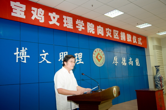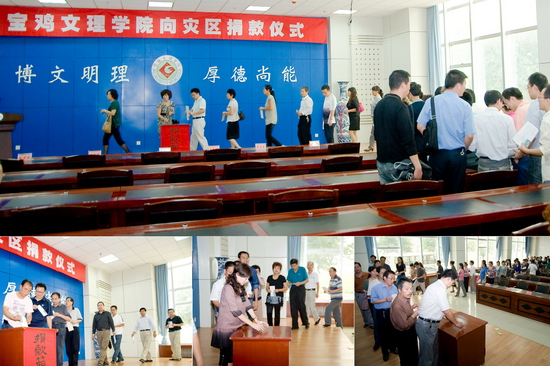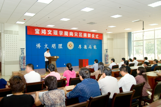 9月16日下午,宝鸡文理学院向灾区捐款仪式在新校区甘棠厅举行。学院机关党委带头组织机关干部职工向灾区捐款。院党委书记、院长王志刚,院党委副书记米晓东、李全武,副院长傅志军、王普藩、赵荣侠以及机关全体党员、职工参加了捐款仪式。捐款仪式由机关党委书记李建民主持。