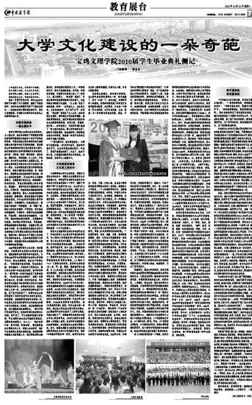 10月18日,《中国教育报》第七版以《大学文化建设的一朵奇葩——宝鸡文理学院2010届学生毕业典礼侧记》为题,对作为大学文化建设,特别是我院2010届学生学位授予仪式和毕业典礼进行了全面介绍。文章从“学生的四载辛勤耕耘,学院的文明建校、文化育人以及和谐、融洽的师生情谊”等三个方面对我院2010届学生毕业典礼进行了深刻、全面的报道,凸显了我院大学文化建设的成就。