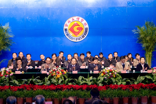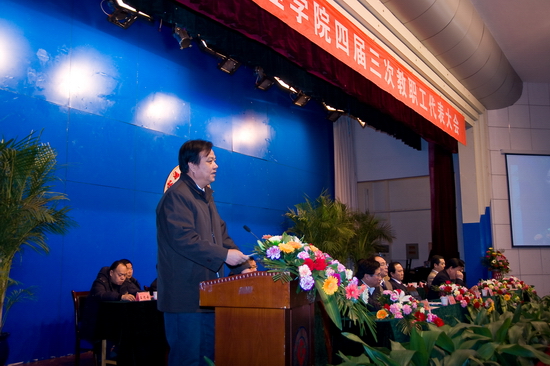王志刚作了题为《总结过去 凝心聚力 继往开来 再谱新篇》的工作报告。报告全面回顾了“十一五”发展规划的完成情况和主要体会,分析了目前面临的机遇与挑战和存在的主要困难与问题,提出了学院“十二五”及中长期发展规划的基本思路和两大历史任务。他在讲到学院“十一五”发展规划完成情况时,具体归纳为八个方面:一是强化教学评建工作,顺利通过并荣获教育部“普通高校本科教学工作水平评估优秀学校”殊荣,教学水平和人才培养质量显著提高;二是强化学科建设和科研工作,获批为国务院学位委员会“新增硕士学位授予单位立项建设高校”,谱写了学院发展的新篇章;三是积极实施人才强校战略,师资队伍结构进一步优化,水平进一步提高;四是以提高大学生综合素质为宗旨,进一步加强学生教育与管理工作,人才培养质量持续提高;五是加强大学文化建设和特色建设,成功举办50年校庆,学院凝聚力、社会知名度和影响力显著提升;六是深化改革,强化服务,后勤服务质量和保障力有了明显提高;七是以人为本,办学效益和教职工收入显著提高;八是强化安全稳定工作,校园精神文明建设迈上新台阶。在讲到五年来的工作体会时,他指出:第一,先进科学的办学理念是学院跨越式发展的前提;第二,师生员工高度的主人翁意识及学院大学精神是实现跨越式发展的宝贵财富;第三,教师队伍、管理队伍和后勤服务队伍爱岗敬业、团结努力、甘于奉献是学院实现跨越式发展的根本原因;第四,求真务实、团结奋进的党政领导班子是学院实现跨越式发展的关键。