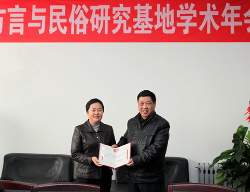 赵荣侠在致辞中代表学院对来自陕、甘两省的关陇方言民俗专家学者莅临大会表示欢迎!她从专业设置、师资队伍、学科建设、人才培养、评估获优、申硕立项等方面介绍了我院的基本情况,并从“关天经济区”建设的高度对基地的建设发展寄予厚望。开幕式上,基地主任赵德利教授宣读了基地聘请平凉市民间文艺协会主席王知三、陇东学院文学院院长徐治堂为兼职研究员的决定,赵荣侠为两位兼职研究员颁发了聘书。