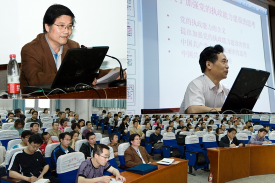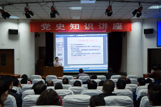 为迎接建党90周年,教育和引导党员深刻认识中国共产党90年光辉历史和中国特色社会主义建设的辉煌成就,增强党性修养,自觉实践社会主义核心价值体系,5月11日下午,机关党委、后勤集团党总支、离退休党总支在老校区综合楼一楼报告厅联合举办党史专题报告会,政法系副主任石玉平教授应邀作了《关于加强党的执政能力建设的思考》的专题报告。报告会由机关党委书记李建民主持。机关党委、后勤集团党总支、离退休党总支全体在职党员、入党积极分子200余人参加了报告会。