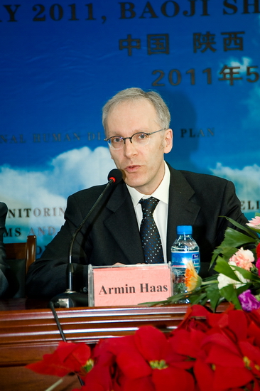 5月12日上午,研讨会开幕式在我院甘棠厅隆重举行。在主席台就座的有曾任中国地理学学会理事长、国际地理学学会中国委员会主席和北京师范大学教务长的张兰生先生,大会主席、德国波兹坦气候影响研究所教授、“国际综合风险防范研究计划(IHDP-IRG)专家委员会委员、欧洲气候论坛综合风险防范计划执行主任Armin Haas博士,中国科学技术协会发展研究中心主任、调研宣传部副部长王康友先生,陕西省教育厅副厅长郭立宏先生,宝鸡市副市长丁琳女士,陕西省科学技术协会党组成员、纪检组长任建斌先生,我院党委书记、院长王志刚博士,副院长赵荣侠博士,省教育厅高教处处长袁宁先生、省教育厅科研处副处长杨晓研先生,宝鸡市科学技术局局长和惠敏女士,宝鸡市科学技术协会党组书记、主席冯宗善先生。